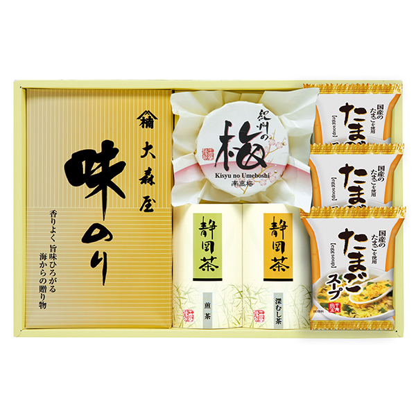 ●大森屋味のり(8切8枚×2)、静岡煎茶40g、静岡深蒸し茶40g、紀州南高梅80g(塩分約8%)、たまごスープ6.4g×3