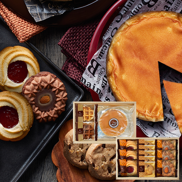 ●チーズケーキ、ロシアケーキ(ブルーベリーサン×3、チョコアーモンド×3)、ナッツとチョコのざっくりクッキー×5、ワッフル(プレーン、チョコ)