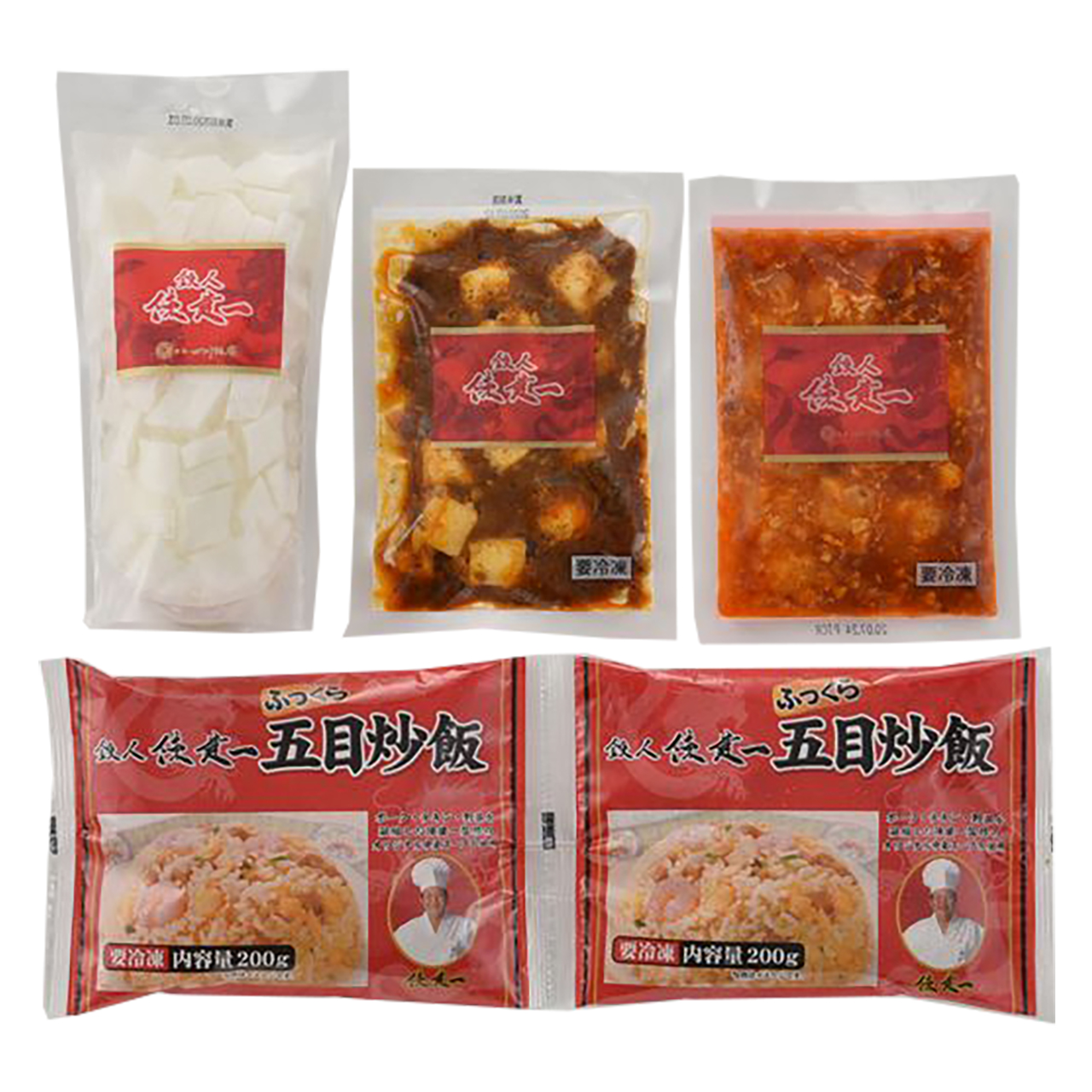 ●本格四川麻婆豆腐150g×1、ふっくら五目炒飯(200g×2)×1、乾焼蝦仁(エビチリソース)150g×1、杏仁豆腐500g×1