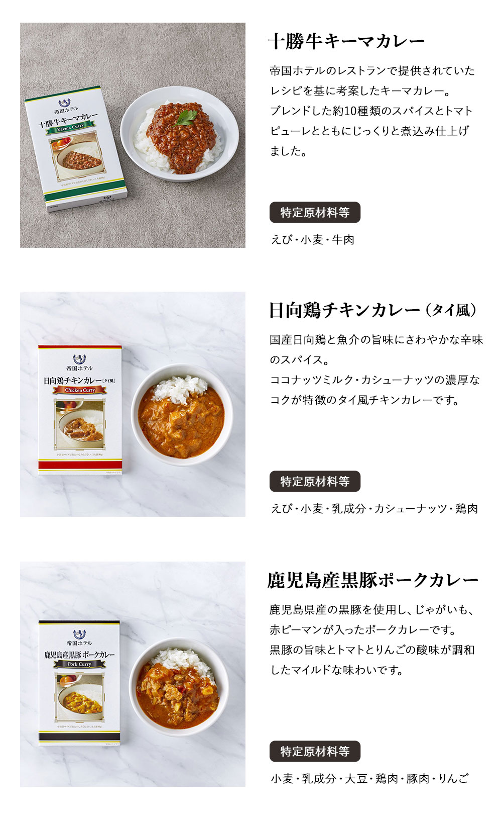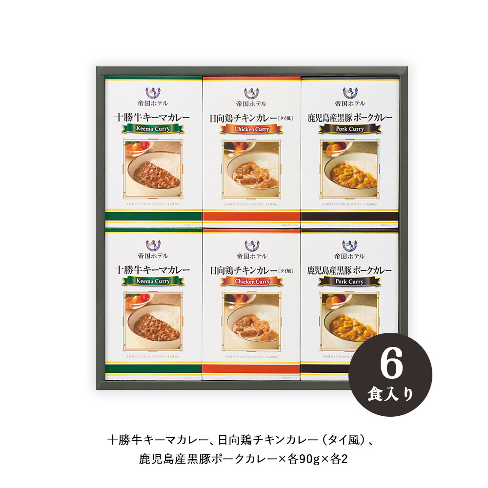 ●箱サイズ約:32.4×33.5×2.6/重さ:800g●化粧箱入●十勝牛キーマカレー90g×2、日向鶏チキンカレー(タイ風)90g×2、鹿児島産黒豚ポークカレー90g×2(全てレトルト) 【アレルゲン:乳成分・小麦・えび・牛肉・大豆・鶏肉・豚肉・りんご・カシューナッツ】 ●加工地:日本●賞味期間:730日●宅配冷蔵区分:常温●「おいしいものを少しずつ味わいたい・・・」そんな声にお応えするために、帝国ホテルが十勝牛、日向鶏を使用して小容量で2種のカレーを作りあげました。それぞれのこだわりのカレーを90gのレトルトパウチに。こだわりの味をお茶碗軽く1杯分の小容量でお楽しみください。帝国ホテル伝統の味わいをご家庭でお召し上がりいただけます。
