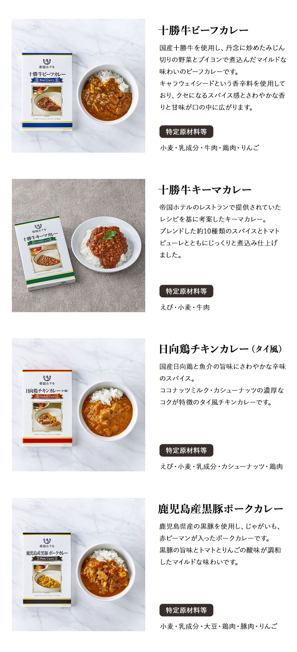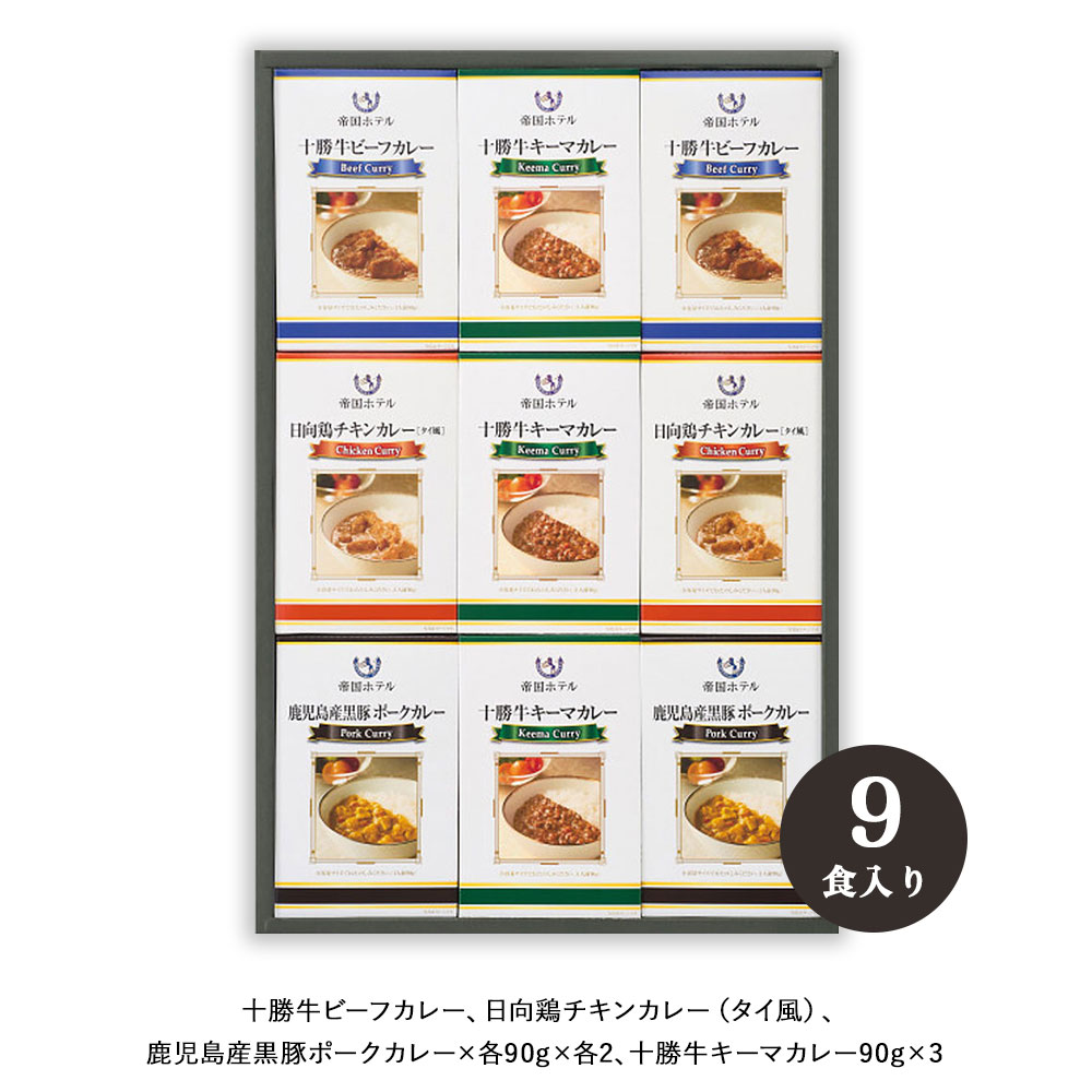 ●箱サイズ約:32.4×49.1×2.6/重さ:1.2kg●化粧箱入●十勝牛ビーフカレー90g×2、十勝牛キーマカレー90g×3、日向鶏チキンカレー(タイ風)90g×2、鹿児島産黒豚ポークカレー90g×2(全てレトルト) 【アレルゲン:乳成分・小麦・えび・牛肉・大豆・鶏肉・豚肉・りんご・カシューナッツ】 ●加工地:日本●賞味期間:730日●宅配冷蔵区分:常温●「おいしいものを少しずつ味わいたい・・・」そんな声にお応えするために、帝国ホテルが十勝牛、日向鶏を使用して小容量で2種のカレーを作りあげました。それぞれのこだわりのカレーを90gのレトルトパウチに。こだわりの味をお茶碗軽く1杯分の小容量でお楽しみください。帝国ホテル伝統の味わいをご家庭でお召し上がりいただけます。