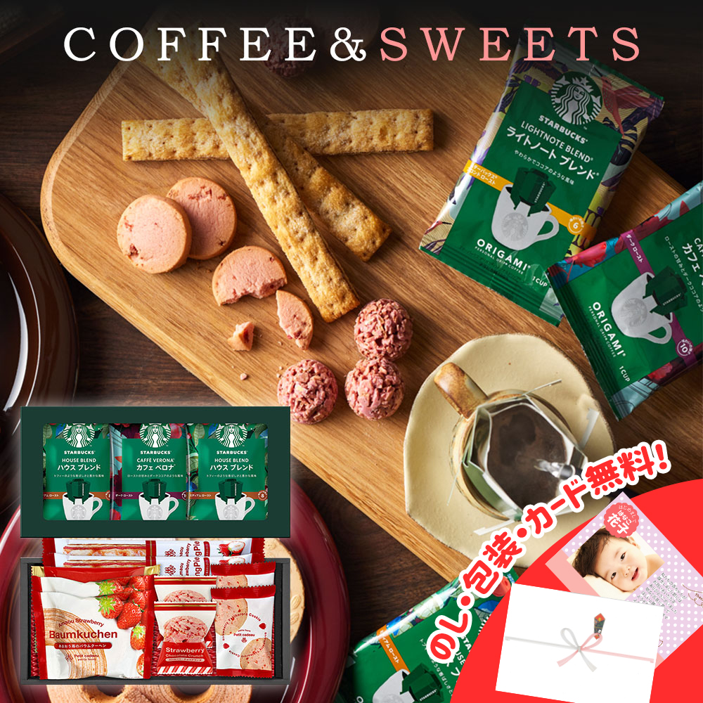 スターバックスオリガミドリップコーヒ―(ハウスブレンド9g×3・カフェベロナ9g×2)、あまおう苺ロングスティックパイ×2、あまおう苺バウムクーヘン×2、あまおう苺ゴーフレット×1、焼きほろろイチゴクッキー×2、ストロベリーチョコクランチ×2