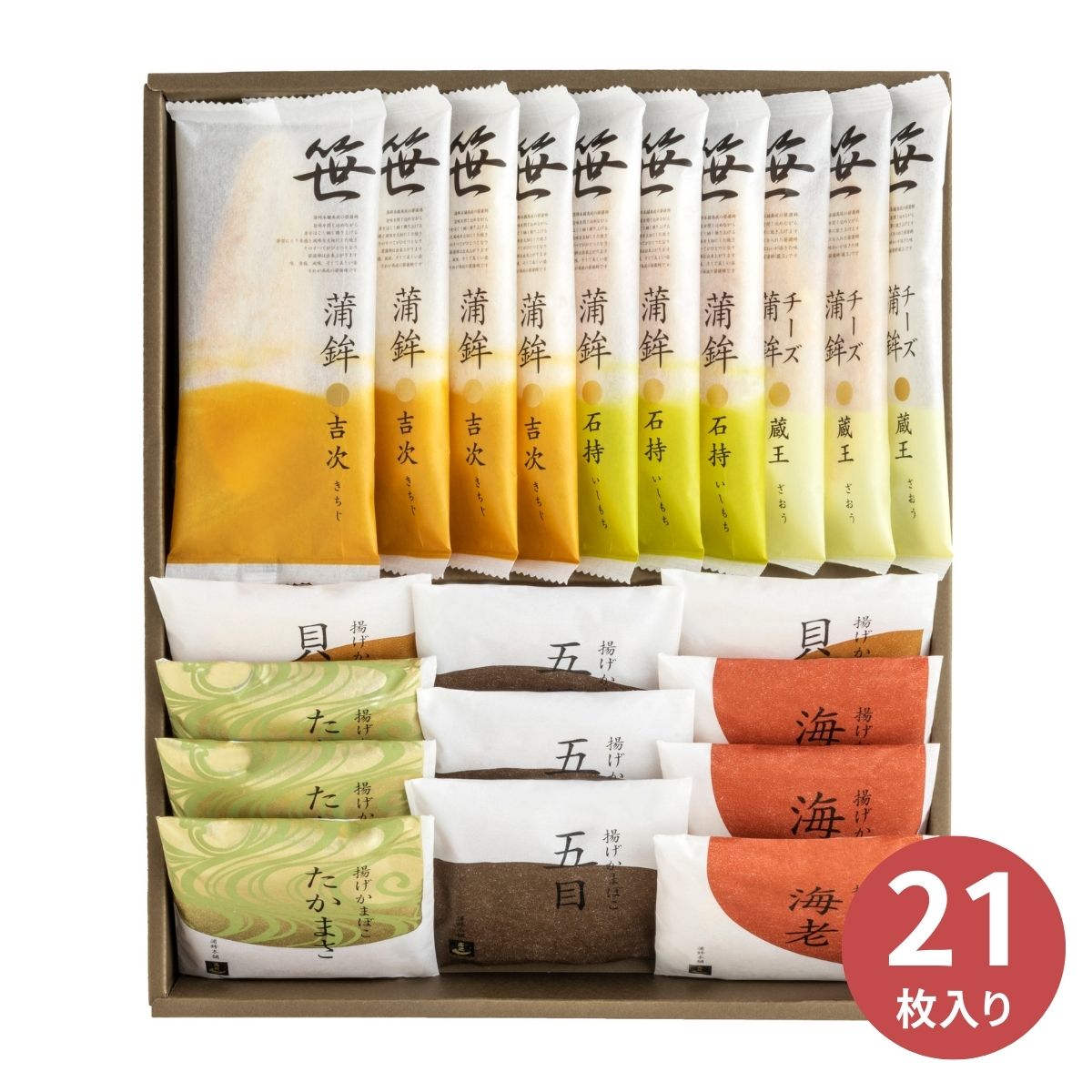宮城名産の笹かまぼこと高政自慢の揚げかまぼこを詰合せました。全て個包装で合計21枚入の商品となります。