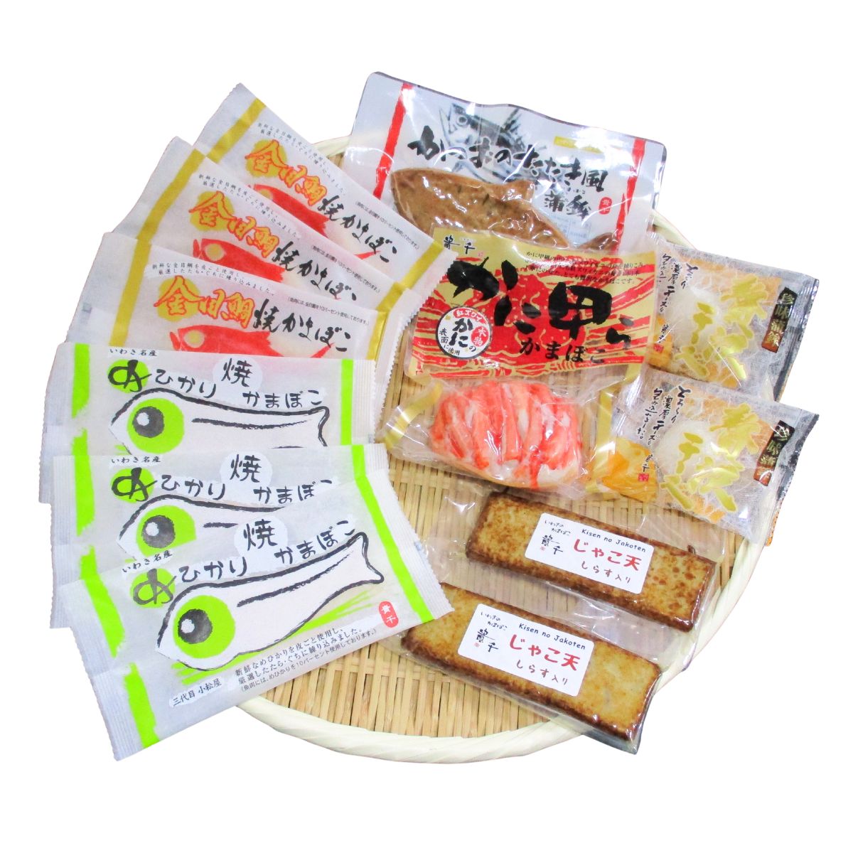 かまぼこの身に「めひかり・金目鯛・かつお」を練り込んだ焼きかまぼこ、かにの甲らの中にかまぼこを詰め表面に隙間なく本物の紅ズワイガニをはったかに甲らかまぼこ、ソフトなかまぼこ生地の中に「チーズ」を包み込んだ一口サイズの珍味蒲鉾チーズ、かまぼこの身にしらすと細かく刻んだごぼうを混ぜて揚げたじゃこ天の詰合せです。