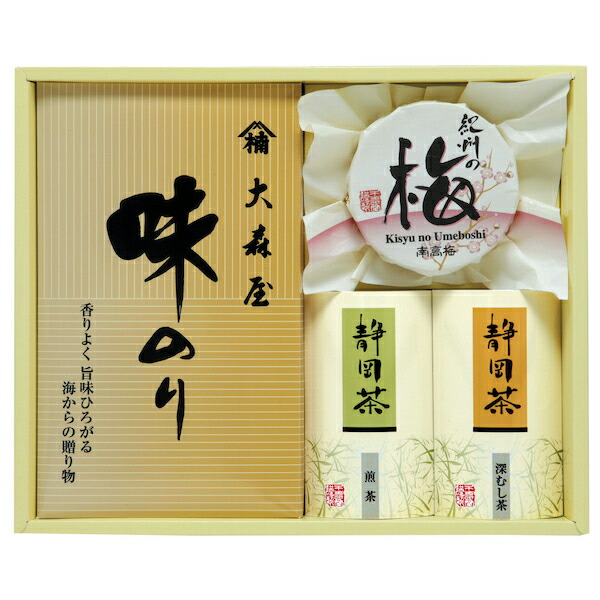 〇商品内容:大森屋味のり(8切8枚×2)、静岡煎茶40g、静岡深蒸し茶40g、紀州南高梅80g(塩分約8%)