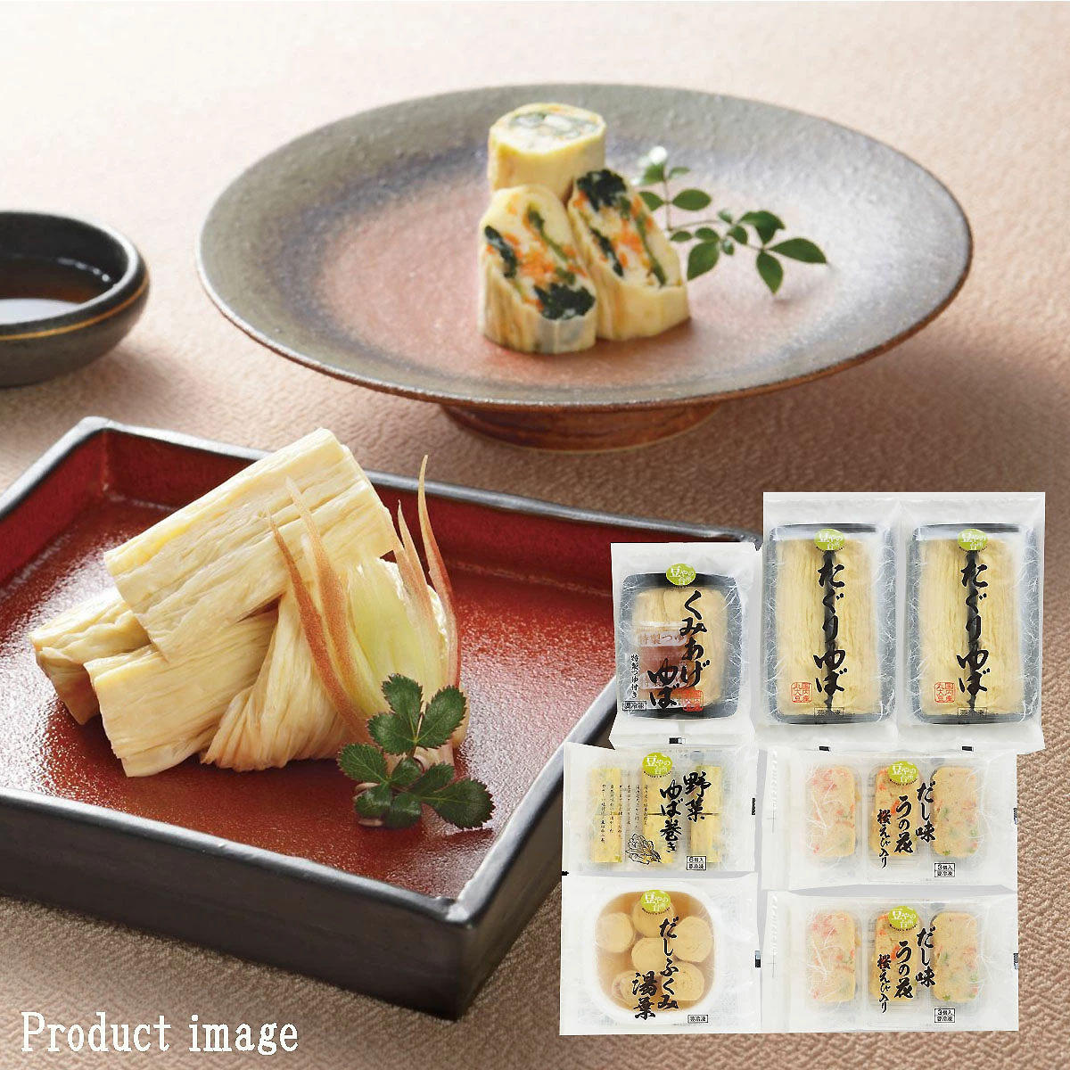 | 内容量 | ●たぐりゆば 70g×2 ●だしふくみ湯葉 130g ●くみあげゆば 90g(ゆば70g つゆ20g) ●野菜ゆば巻き 102g ●だし味うの花桜えび入り 135g×2 |