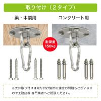 | 天井、壁吊り下げ用の金具セットです。 ハンモック 、ブランコ、サスペンショントレーニング、クライミングロープ吊り下げなどにお使い頂けます。 |