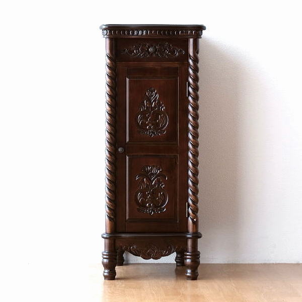 クラシックで上品な雰囲気ただようアンティークな家具の世界…。一緒に置いたり飾ったりする小物もいっそう上品な印象を与えます。花模様などの飾り彫刻や緩やかなカーブを描いた天板などシックなカラーに気品と重厚感が漂う存在感たっぷりの個性派フェイスの家具は、アジアン、エスニック、アンティーク、リゾート風、和風など幅広いインテリアに似合いそうです。スリムな形の扉のキャビネットは小さくても存在感がありリビングでも主役級のデザイン力。電話台や花台にお勧めです。※棚は取り外しが出来、家庭用の消化器なども入れられそうです。