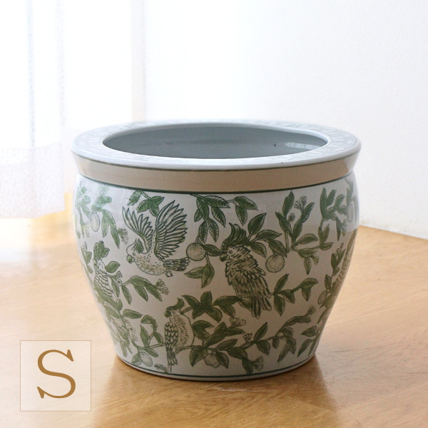 [ 鉢カバー 陶器 おしゃれ 10号 8号鉢用 30cm 穴なし 緑花鳥 火鉢 シノワズリ 和風 モダン レトロ 植木鉢カバー プランターカバー 玄関 室内 屋外 水鉢 睡蓮鉢 メダカ鉢 金魚鉢 ビオトープ ワインクーラー 花器 ]