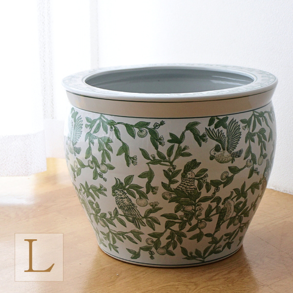 鉢カバー 陶器 おしゃれ 14号 10号鉢用 40cm 大型 穴なし 火鉢 シノワズリ 和モダン 玄関 室内 屋外 睡蓮鉢 メダカ鉢 陶器の火鉢 緑花鳥 L