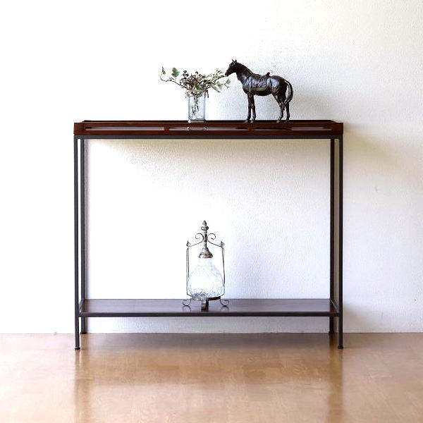 コンソールテーブル 玄関 スリム おしゃれ 花台 木製 棚付き 2段 ワイド 天然木 無垢材 幅90 完成品 チークとアイアンのコンソールテーブル