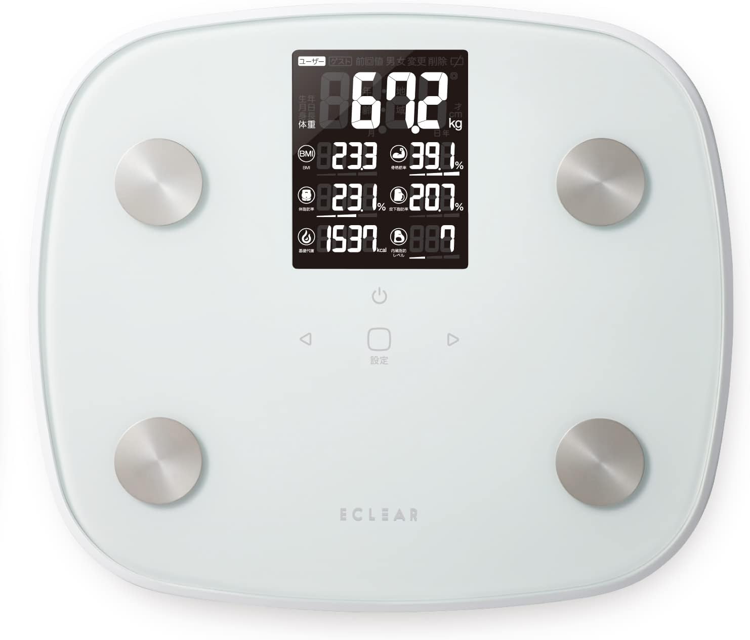〜製品本体の液晶画面を大きくし、測定データの一覧表示を可能にした“エクリア体組成計”です。MRI測定データに基づき腹部全体の内臓脂肪を算出する体積推定方式を筑波大学と共同で開発。 100g単位の精密な測定が可能で、内臓脂肪レベル・体脂肪率・骨格筋率・皮下脂肪率・基礎代謝など8項目を測定可能です〜