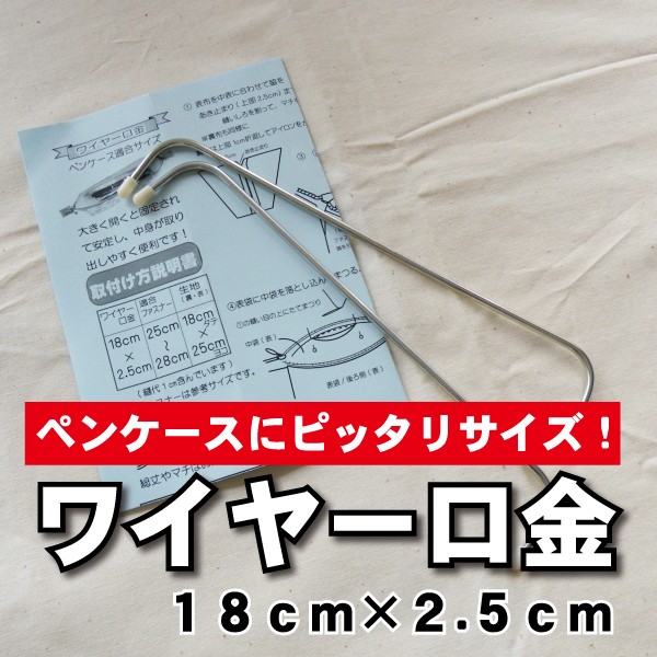 | 関連商品 | 【ワイヤー口金単品】 ワイヤー口金10cm・1組 ワイヤー口金12.5cm・1組 ワイヤー口金15cm・1組 ワイヤー口金18cm・1組 ワイヤー口金18cm×2.5cm(ペンケース用)・1組 ワイヤー口金20cm・1組 【スターターキット】 ワイヤー口金スタータキット15cm ワイヤー口金スタータキット18cm ワイヤー口金スタータキット18cm(ペンケース用) |