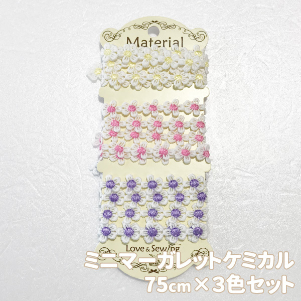 \小花のミニケミカルレース3色×各75cmセット/カラフル 花モチーフ マーガレット ケミカルレース 可愛いモチーフレース