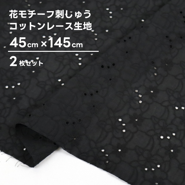 ≪花モチーフの刺しゅうが入った コットンレース生地 45cm×145cm 2枚入≫花柄 刺しゅう 刺繍 綿100% コットン 生地 はぎれ カット生地 シックなブラックレース