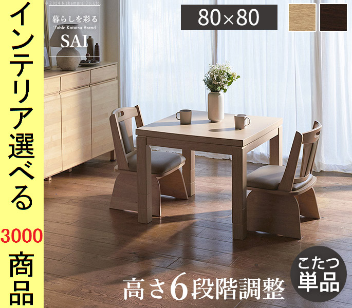 こたつ テーブル 80×80×45cm ダイニングタイプ 高さ6段階調節可 ファン式ヒーター付き ナチュラル・ブラウン色 YNG0100117