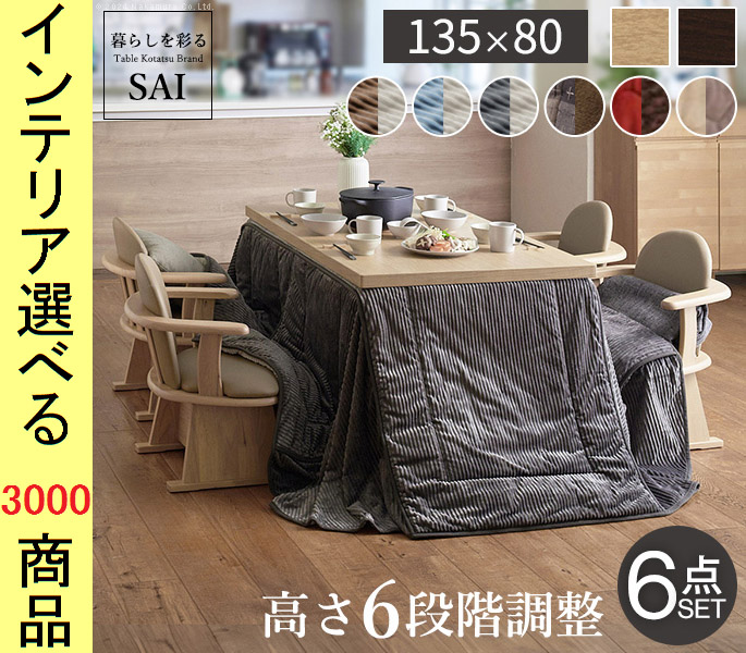 こたつセット テーブル+掛布団+肘置き付き回転椅子4脚 135×80×45cm ダイニングタイプ 高さ6段階調節可 ファン式ヒーター付き 2色展開 YNI3300263
