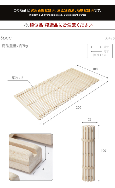 睡眠用すのこ 100×210×2.5cm 木製 桐 溝付き ロール収納可能 シングル ベージュ色 YNT0500003