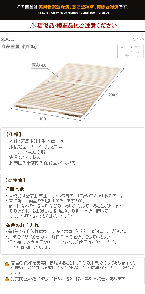 睡眠用すのこ 100×200.5×4cm 木製 桐 キャスター・縦板溝付き 2つ折りタイプ シングル ベージュ色 YNT0500087
