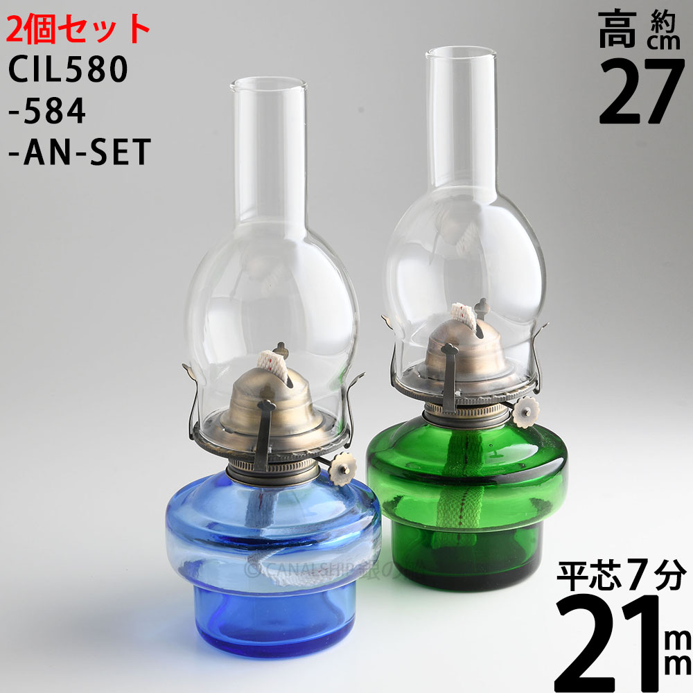 2個セットのサービス品です!緑の油壷1個+緑の油壷1個、緑の油壷2個、ブルーの油壷2個、の組み合わせをお選びいただけます。もともとは吊りランプの油壷ですが、底が広く厚手のガラスで見た以上に非常に安定感がありテーブルランプとしてデビューしました。また吊りランプのパーツ(カサ、フレーム)をお求め頂ければ吊りランプとしバージョンアップできます。芯は7分芯(約21mm幅)を使用し、弊社のオイルランプの中でも光量のあるランプで、白熱電球約15W弱程度の明るさがあります。これは食卓の上のオイルランプ1台で、何とか食事ができたり、新聞程度の文字がランプに近づければ読める程度です。サイズ的にも、使いやすいサイズであり、万が一の停電時にも重宝する実用品です。燃料はレインボーオイルもお使いいただけますが石油ファンヒータなどで使う灯油もお使いいただける心強いランプです。テーブルランプとして食卓でお使いいただく場合、蛍光灯の明るさは、期待できませんが、ムードのあるオイルランプの炎でロマンチックなひととき時が過ごせます。 幅約10.5cmx奥行10.5cmx高さ約27.5cm(商品によりばらつきがあります)