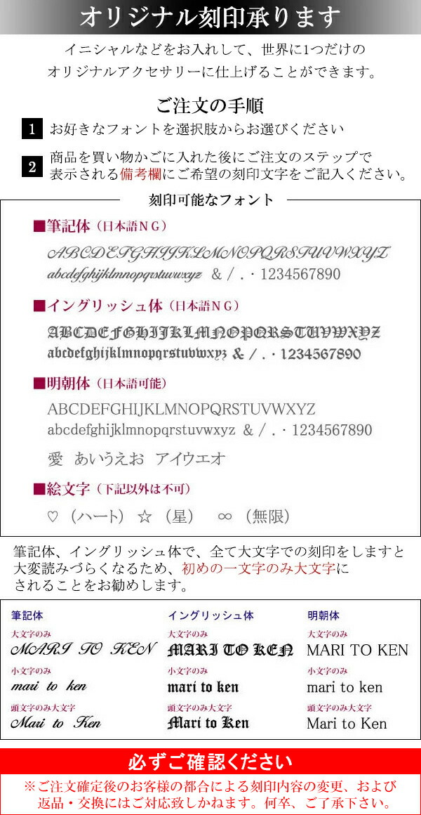 ※ご希望の刻 印文字は商品をお買い物かごに入れた後、ご注文ステップ時の備考欄に、メンズ・レディースそれぞれご記入下さい。