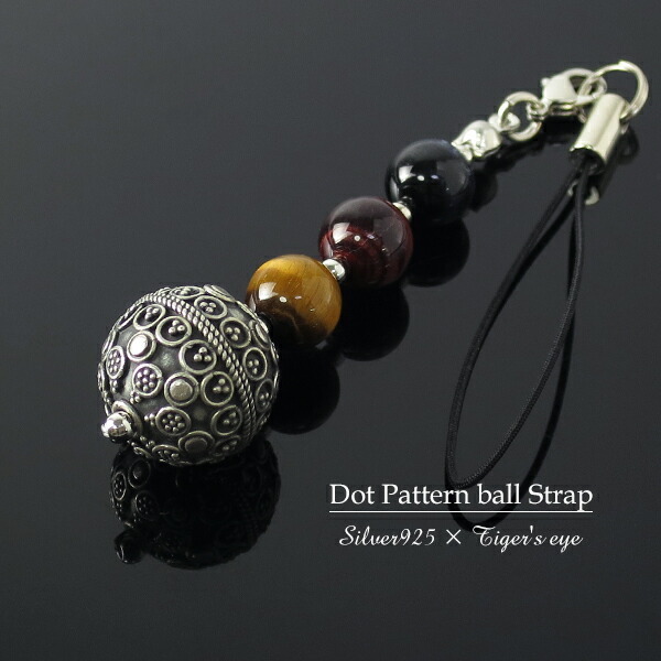ガムランボール風 ドットパターンボール 天然 タイガーアイ アクセサリーストラップ シルバー925 天然石 ブルー レッドタイガーアイ