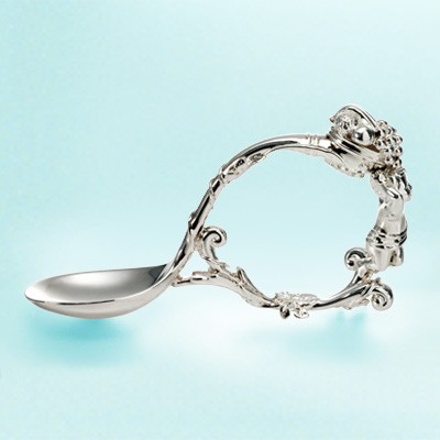 フルーツの盛り籠を中心に、赤ちゃんが持ちやすいように、持ち手が輪型にデザインされたスプーンです。