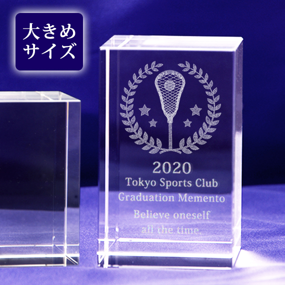 卒団記念品 名入れ ラクロス 記念品 メッセージ彫刻 3D クリスタルペーパーウェイト ガラスブロック 高さ100mm 彫刻代込み /NKTR-0263