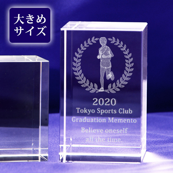 大会表彰 記念品 マラソン 陸上競技 名入れ メッセージ彫刻 3Dマラソン クリスタルペーパーウェイト ガラスブロック 高さ100mm 彫刻代込み /NKTR-0263