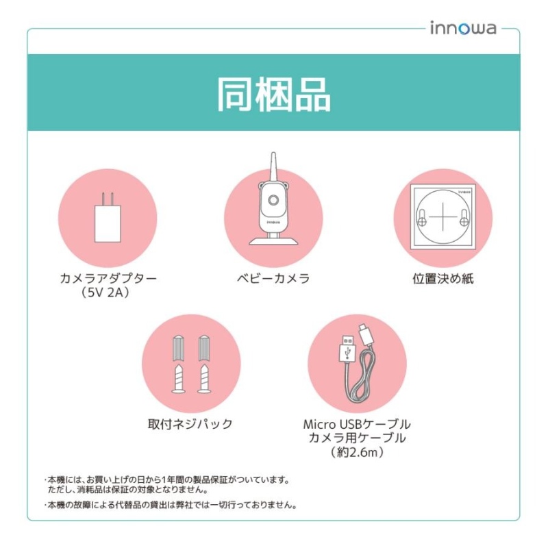 本体(ベビーモニター + ベビーカメラ)、モニターアダプター(5V 1A)/カメラアダプター(5V 2A)、USB Type-C モニター用ケーブル(約1m)/Micro USBケーブル カメラ用ケーブル(約2.6m)、取付ネジパック、取付アーム、位置決め紙、取扱説明書、