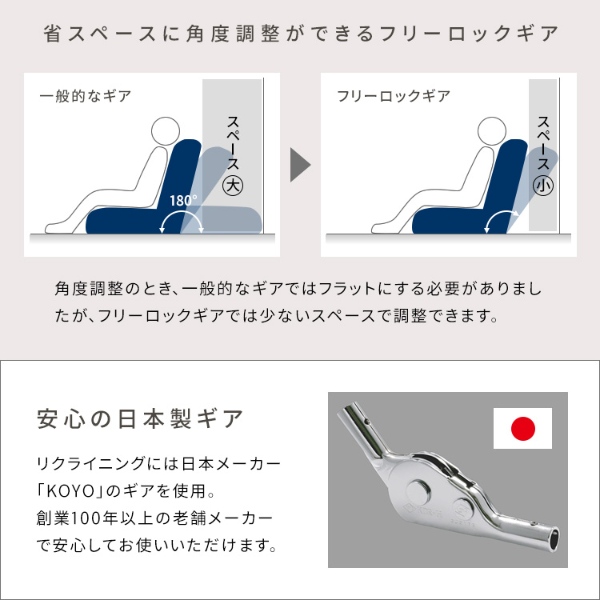 18段階フリーロックリクライニングでお好みの角度に調整可能。カラーはホワイト、ベージュ、ピンク、グレーの4種類。お部屋の雰囲気やお好みでお選びいただけます。