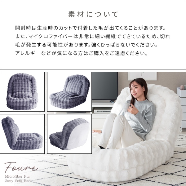 座椅子・ソファ・ベッドの3wayでお使いいただけて一日中過ごせる巣ごもりふわとろソファベッド『Foure(フール)』。とろけるような肌触りが気持ち良いマイクロファイバー生地とふかふかクッションがあなたを癒してくれます。