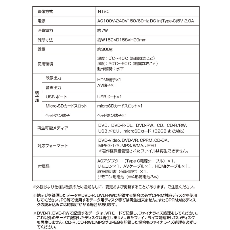 ■対応フォーマット:DVD-Video、DVD-VR、CPRM、CD-DA、MPEG-1/2、MP3、WMA、JPEG