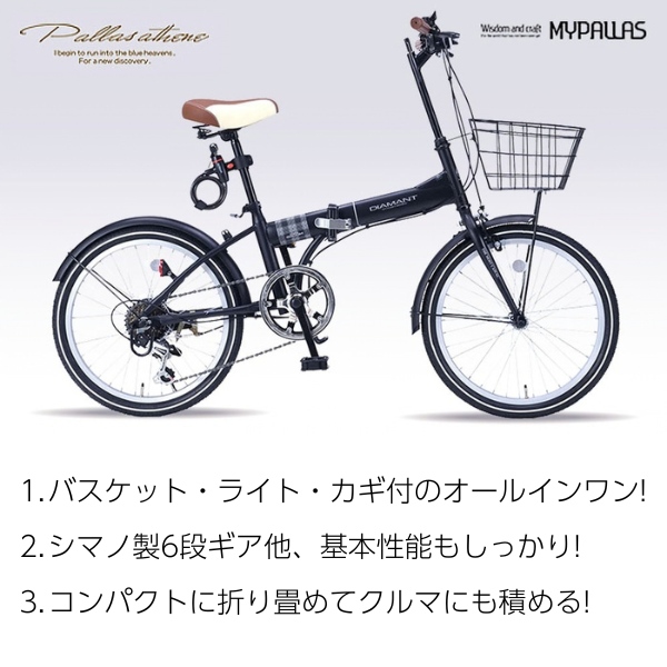 折りたたみ自転車 20インチ 6段変速 バスケット付き LEDライト付き 鍵付き 折り畳み MYPALLAS マイパラス MF205-BK マットブラック/srm