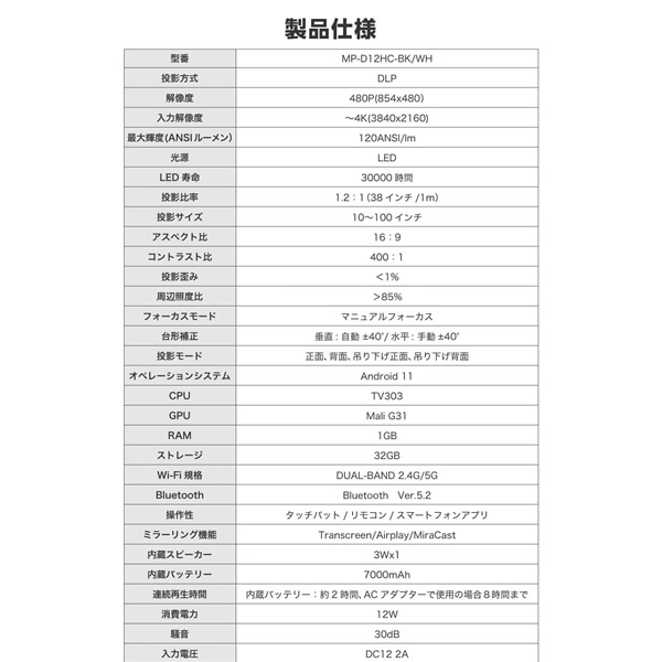 【メーカー直送】プロジェクター 家庭用 4K対応 ポータブル Wi-Fi2.4G/5G 7000mAh Bluetooth5.2 Android11 MAXZEN マクスゼン MP-D12HC-BK/srm