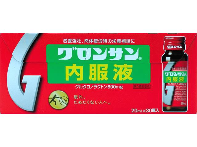【第3類医薬品】市販薬 グロンサン内服液は、肝臓に作用するグルクロノラクトン600mgに、4種類のビタミンを配合したドリンク剤です。肉体疲労時、体力低下、食欲不振など滋養強壮に効きます。成人(15才以上)1日1回、1瓶(20ml)を服用します。<ライオン株式会社>20ml×30本入