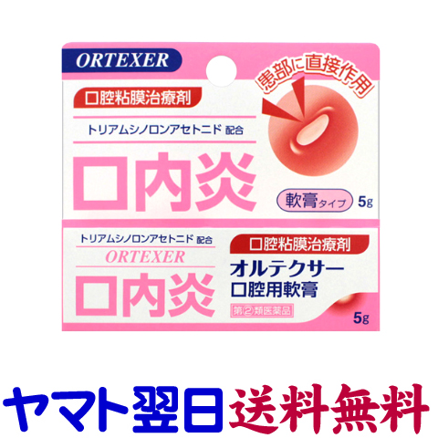 ★★南東北〜九州まで全国あすつく★★【指定第2類医薬品】市販薬 オルテクサーは口腔用軟膏のトリアムシノロンアセトニドを有効成分とする口内炎治療薬です。アフタ性口内炎の出来やすい口腔粘膜に、優れた付着力で患部を保護するとともに、抗炎症作用により患部の炎症を抑えて痛みを改善していく軟膏です。1日1〜数回、適量を患部に塗布してください。1患部に1回約3mm(米粒大)が目安です。ジェネリック <福地製薬>【5g入】