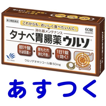 ★★南東北〜九州まで全国あすつく★★【第3類医薬品】市販薬 タナベ胃腸薬ウルソは、脂肪による胃もたれ・消化不良に1日1錠で消化器メンテナンス。主成分のウルソデオキシコール酸(UDCA)50mgが肝臓に作用して、胆汁酸の分泌を促進し、肝細胞を保護して消化機能を回復・改善します。加齢による消化不良、胃もたれ、胃部腹部膨満感、食べ過ぎなどに効きます。<田辺三菱製薬>【60錠入】
