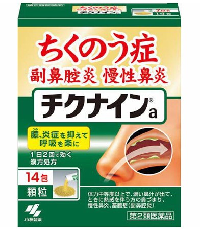 【第2類医薬品】市販薬 チクナインa(顆粒)は、ちくのう症状(副鼻腔炎)、慢性鼻炎を改善する内服薬です。9種の生薬からなる漢方処方「辛夷清肺湯」で鼻の奥の炎症を鎮めながら、膿を抑えて呼吸を楽にします。1日2回。<小林製薬>【14包入】