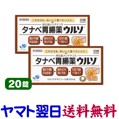 ★★南東北〜九州まで全国あすつく★★【第3類医薬品】市販薬 タナベ胃腸薬ウルソ(20錠×2個セット)は、脂肪による胃もたれ・消化不良に1日1錠で消化器メンテナンス。主成分のウルソデオキシコール酸(UDCA)50mgが肝臓に作用して、胆汁酸の分泌を促進し、肝細胞を保護して消化機能を回復・改善します。加齢による消化不良、胃もたれ、胃部腹部膨満感、食べ過ぎなどに効きます。成人(15歳以上)は1日1回1錠を夕食前、または夕食後に服用してください。15歳未満は服用しないでください。<田辺三菱製薬>【20錠入×2個セット】