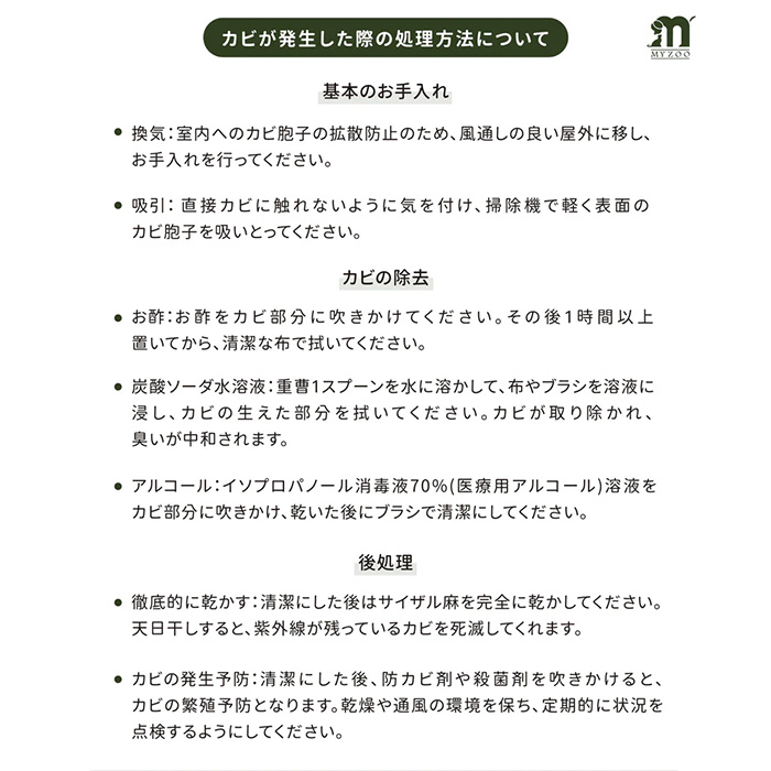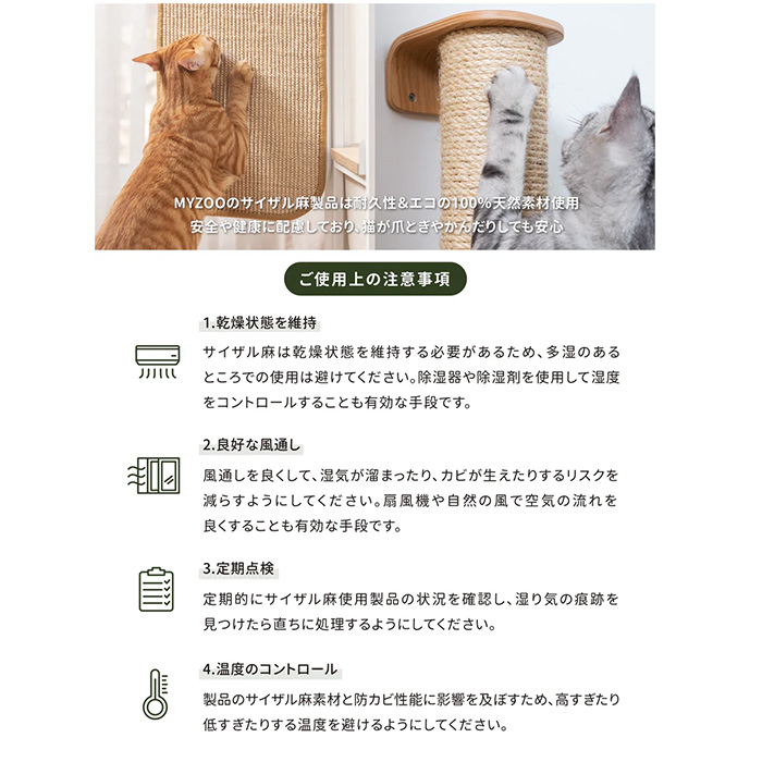 ひっかきに強く、くずが落ちにくい100%天然サイザル麻を使用しているため、安心して使用することができます。