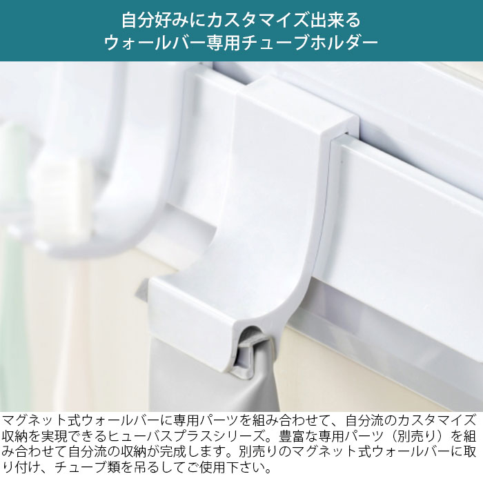 ●マグネット式ウォールバーに専用パーツを組み合わせて自分流の収納が出来る、ヒューバスシリーズのチューブホルダーです。
