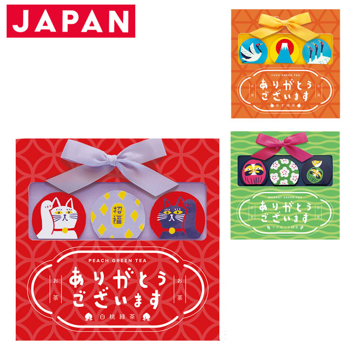 | 種類 | 【12061/招き猫(白桃緑茶)】 国産緑茶のまろやかな旨みに瑞々しい白桃の味わいが絶妙にマッチしたフレーバー緑茶です。 【12062/だるま(マスカット緑茶)】 国産緑茶のまろやかな旨みと爽やかなマスカットのハーモニーが楽しめるフレーバー緑茶です。 【12063/富士山(ゆず緑茶)】 国産緑茶のまろやかな旨みにゆずが爽やかに香るフレーバー緑茶です。 |