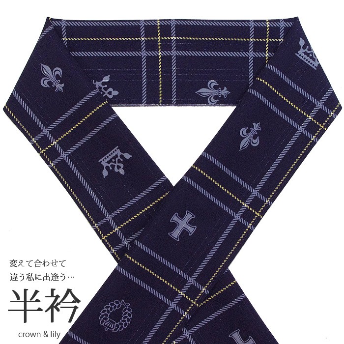 紺色地に黄色・グレー・ラメのチェック柄に王冠・十字架・百合の紋章柄の半衿です♪