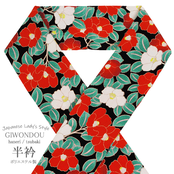 黒色地に赤と白色の椿と緑いろの葉の模様です。
