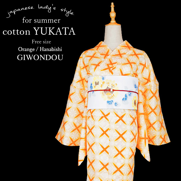 やわらかな薄オレンジの地に、オレンジ色と白色の花菱模様がリズミカルに浮かぶ、優しさと粋さを兼ね備えた一枚。