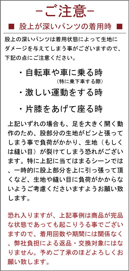 足を大きく開く動作の際は、股部分に負荷がかかり、生地(もしくは縫い目)が裂けてしまう恐れがございます。特に上記に当てはまるシーンでは、一時的に股上部分を上に引っ張って頂くなど、ご考慮下さいますようお願い致します。