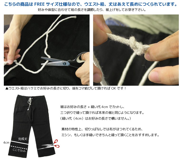 サイズ(FREE):ウエスト106、ヒップ118、股上34、股下37、ワタリ37、裾幅29。(UNISEX)ウエスト91、ヒップ112、股上28.5、股下32、ワタリ28.5、裾幅27。