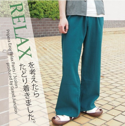【GrandJunction-Relax】(グランドジャンクション)より、これまで大人気のリラックスイージーパンツシリーズにプリペラ素材イージーパンツが登場!!バルクのあるプリペラ素材により、リラックス本来の柔らかな雰囲気とタフさを合わせ持ったイージーパンツとなりました。カラーは、ブルーグリーン、ナチュラル、ネイビーの3色。サイズは、ユニセックスサイズ、メンズフリーサイズの2サイズ展開として、男女問わず選んでいただけるパンツになっております。