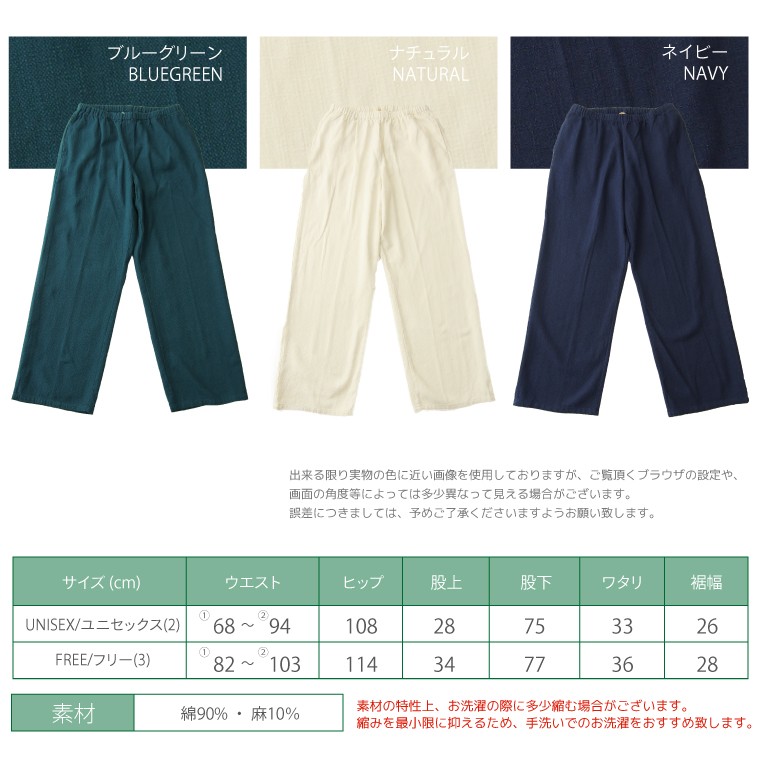 (FREE):W82~103、H114、股上34、股下77、ワタリ36、裾幅28。